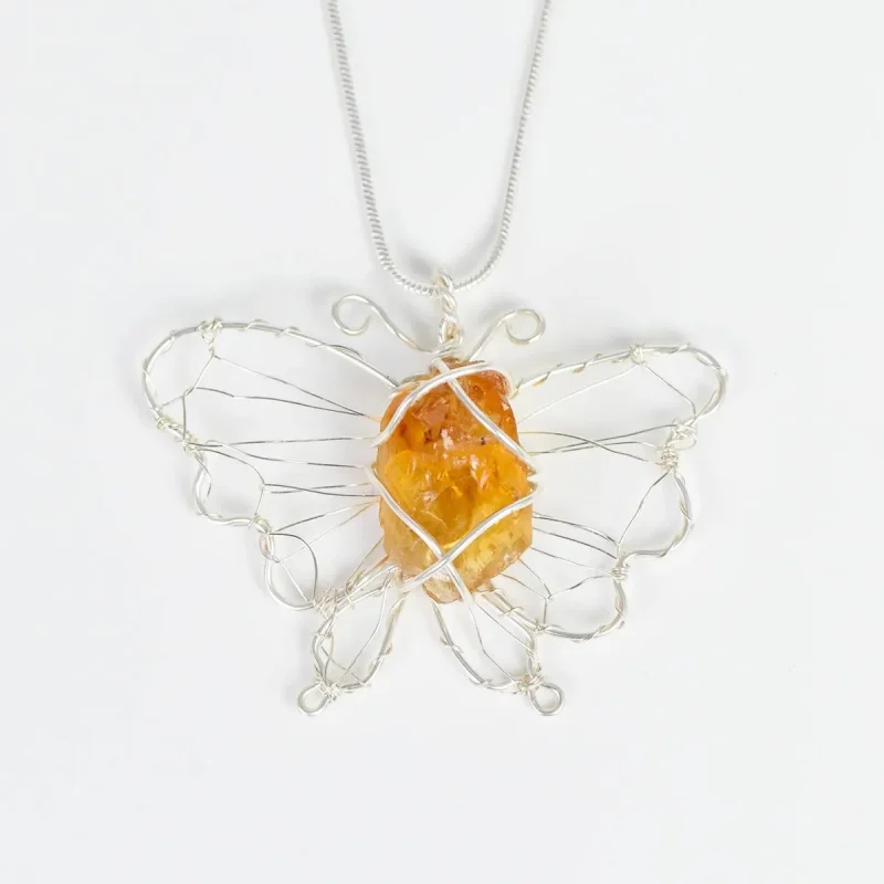 The Butterfly Pendant [Hand Wound Wire] is a uniquely designed handcrafted pendant featuring a delicate butterfly form and a selection of curated crystals and gemstones, bringing a touch of natural beauty and mystique to your ensemble. This pendant combines the depth of Amethyst Crystal, the vitality of Citrine Crystal, the freshness of Green Fluorite Crystal, and the nobility of Lapis Lazuli.