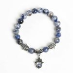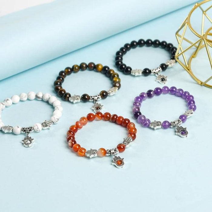 Turquoise symbolizes protection, healing, and good fortune, bringing inner calm and positive energy while enhancing communication skills and self-confidence. Obsidian is renowned for its ability to promote emotional balance and protection, absorbing and transmuting negative energy, offering spiritual protection and increased self-awareness. Red Agate boosts vitality and physical strength, symbolizing energy and passion, helping you face challenges with determination. Rose Quartz, as the stone of love, is closely connected to the heart chakra, fostering self-love and compassion for others, bringing emotional stability and harmony. Red Jasper, with its energy of determination and perseverance, helps you manifest your goals, providing a sense of stability and security. Tiger Eye instills courage, strength, and self-confidence, helping you see and think more clearly, while warding off the evil eye. Labradorite is admired for its changing play of colors and enhancing intuition, aiding in spiritual growth. Green Aventurine, associated with the heart chakra, promotes love, compassion, and emotional well-being, bringing balance and harmony. Amethyst, with its deep purple tones and calming energy, symbolizes optimism and hope, aiding in meditation and spiritual practice. Sodalite, welcomed for its deep blue color and promoting clear thinking, enhances communication skills.