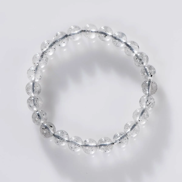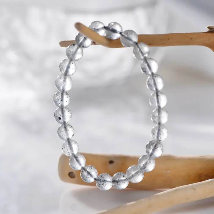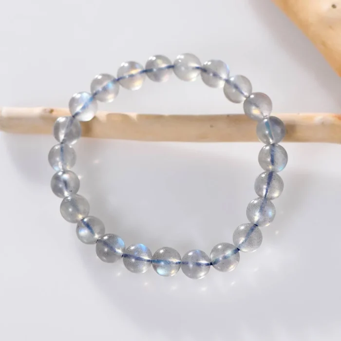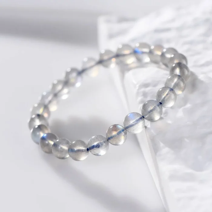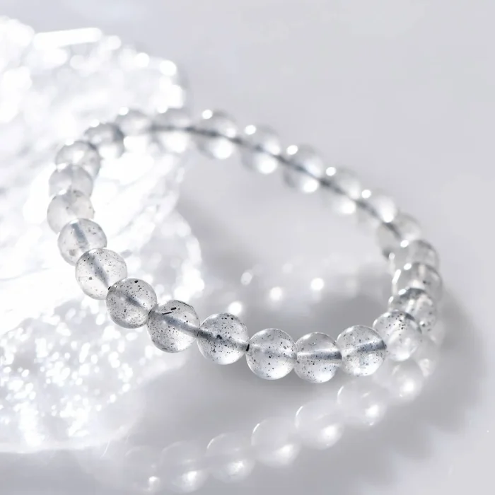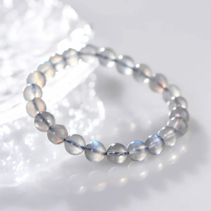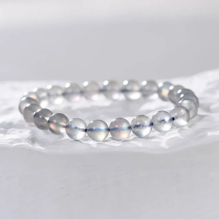 Gray Moonstone Bracelet strung with gray moonstone beads, emits a unique luster and symbolizes new beginnings and inner growth. This bracelet aids in enhancing intuition, relieving stress, promoting emotional balance, and spiritual growth, making it an ideal choice for daily wear or special occasions.