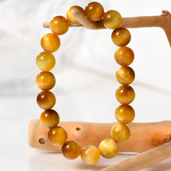 The Light Tiger Eye Stone Bracelet features the soft-hued tiger eye stones, renowned for their golden to brownish colors and unique optical phenomenon known as chatoyancy, which gives the stone its “tiger eye” name. This semi-precious gemstone has been cherished for its beauty and physical properties since ancient times. It symbolizes luck, bravery, and protection, holding significant meaning across various cultures. In Egyptian culture, the stone was used to ward off evil spirits; in Roman and Greek cultures, warriors wore it for courage in battle; and in Chinese culture, it represents success and fortune.
