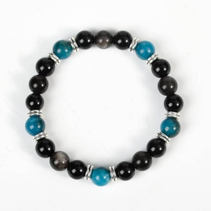 Obsidian Meteorite Planet Bracelet, a bracelet that combines the mystery of obsidian with the energies of various crystals. White buffalo turquoise for courage, tiger eye stone for strength, apatite for intuition, red agate for passion, labradorite for spirituality, green aventurine for wealth, and amethyst for wisdom. Each crystal is a messenger from the cosmos, guarding your journey among the stars