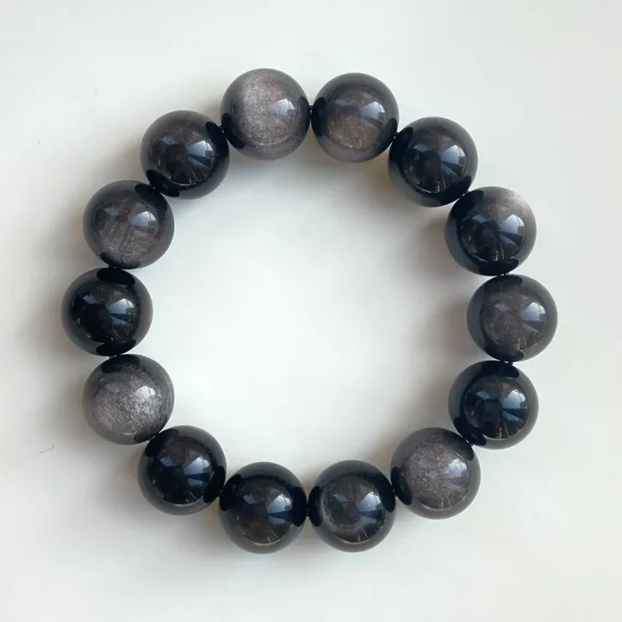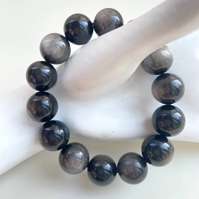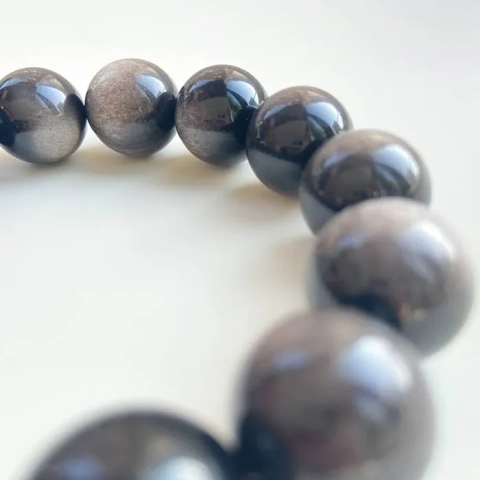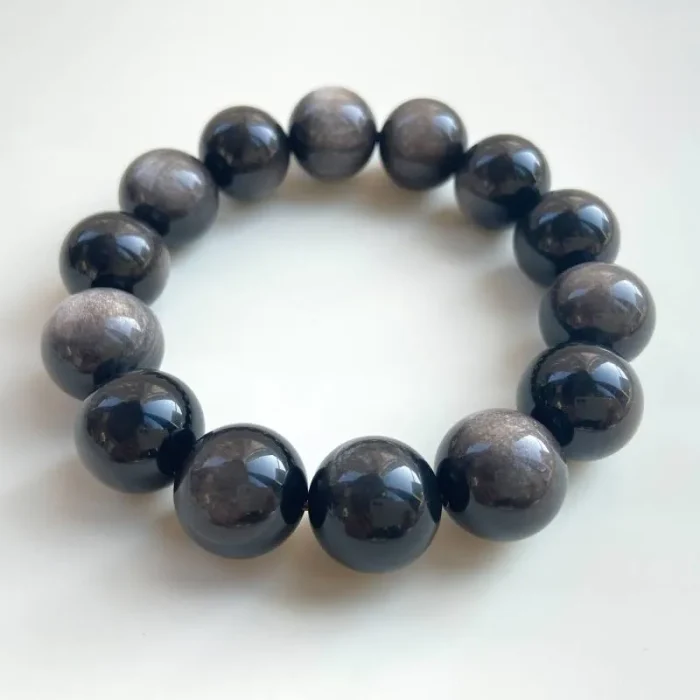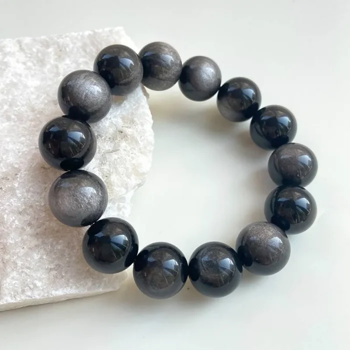 The Silver Obsidian Bracelet, with its unique silver sheen and deep black color, is a rare find among many crystals, known not only for its collectible value but also for its mysterious power. Silver Obsidian, also known as Silver Sheen Obsidian, is a rare variety of the obsidian family, a non-crystalline, silicate, natural volcanic glass formed by the rapid cooling and solidification of volcanic lava. This crystal contains silver mineral components, which give Silver Obsidian a silver sand-like “eye” when reflected in light.